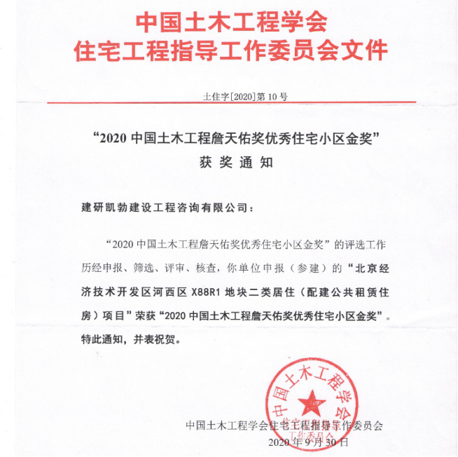 近日,建研凱勃建設(shè)工程咨詢有限公司(以下簡(jiǎn)稱“建研凱勃”)監(jiān)理的北京經(jīng)濟(jì)技術(shù)開發(fā)區(qū)河西區(qū)X88R1地塊二類居?。ㄅ浣ü沧赓U住房)項(xiàng)目榮獲2020中國土木工程詹天佑獎(jiǎng)優(yōu)秀住宅小區(qū)金獎(jiǎng),這是繼該項(xiàng)目獲得北京市結(jié)構(gòu)長(zhǎng)城杯金質(zhì)獎(jiǎng)后的又一重大獎(jiǎng)項(xiàng)。