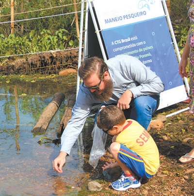 在位于巴西圣保羅州的伊利亞電站附近,三峽巴西員工帶領(lǐng)電站周邊社區(qū)孩子一起放流魚(yú)苗,并講解相關(guān)知識(shí)。三峽巴西供圖