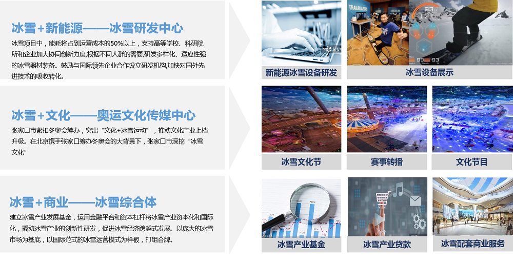 冰雪體育產(chǎn)業(yè)協(xié)同——依托“奧運(yùn)+”,發(fā)展冰雪體育產(chǎn)業(yè),提升賽事綜合效益,發(fā)展“冰雪+”產(chǎn)業(yè)重點(diǎn)項(xiàng)目。與特色產(chǎn)業(yè)結(jié)合發(fā)展,打造“一地一品”“一地多品”的特色冰雪產(chǎn)業(yè)。