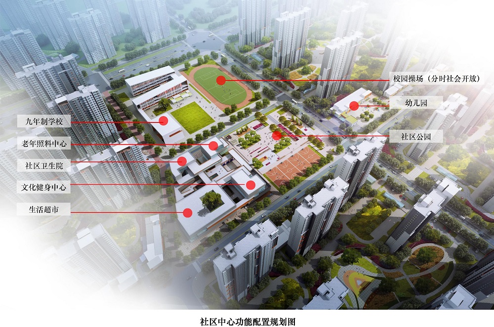 將生活超市、文化娛樂、全民健身、社區(qū)醫(yī)療、老年照料、九年制學(xué)校、社區(qū)公園、幼兒園和管理服務(wù)等社區(qū)類級的公共設(shè)施相對集中或鄰近布局,實現(xiàn)了便利化使用和規(guī)模化經(jīng)營的雙重目標(biāo)。規(guī)劃同時兼顧設(shè)施抗擾和共享平衡的問題:醫(yī)療、養(yǎng)老相互結(jié)合,教學(xué)設(shè)施相對獨立,學(xué)校操場臨近社區(qū)公園和文體中心布置,方便對外開放和聯(lián)動使用。