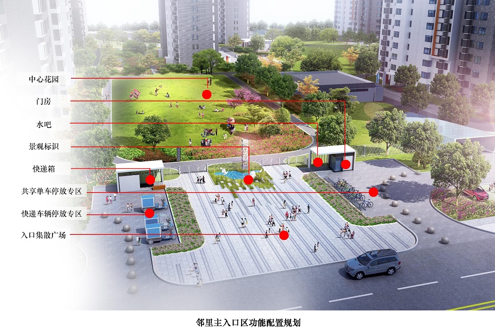主入口實行人車分流組織,設(shè)置集散廣場、景觀標(biāo)識和中心花園。精細(xì)化布局門房、快遞箱、水吧、共享單車與快遞車輛停放專區(qū),形成功能強大的新型住區(qū)入口服務(wù)系統(tǒng)。