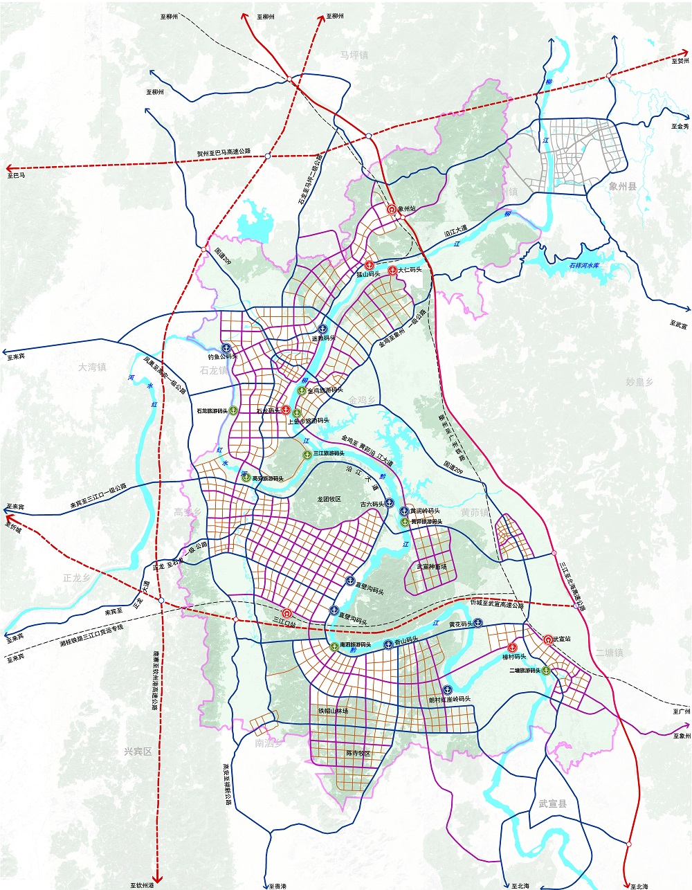 高效綜合交通系統(tǒng)規(guī)劃——以區(qū)域性交通互聯(lián)互通為突破點,形成以港口、鐵路、公路為核心的多式聯(lián)運對外綜合交通體系,強(qiáng)化以港口碼頭為中心建設(shè)通往柳州、河池等周邊城市以及通往粵港澳大灣區(qū)城市的黃金水道;重點推進(jìn)三江口新區(qū)產(chǎn)業(yè)組團(tuán)與國道209、國道355等區(qū)域性交通干道的銜接;完善以港區(qū)港口為支點的港產(chǎn)城融合發(fā)展體系:加快石龍碼頭、直壁溝碼頭、黃泥嶺碼頭及其配套設(shè)施的建設(shè),以港口為依托,完善集疏運體系,促進(jìn)港口與腹地經(jīng)濟(jì)良性循環(huán)發(fā)展,驅(qū)動新區(qū)從“碼頭經(jīng)濟(jì)”走向港產(chǎn)城融合發(fā)展。