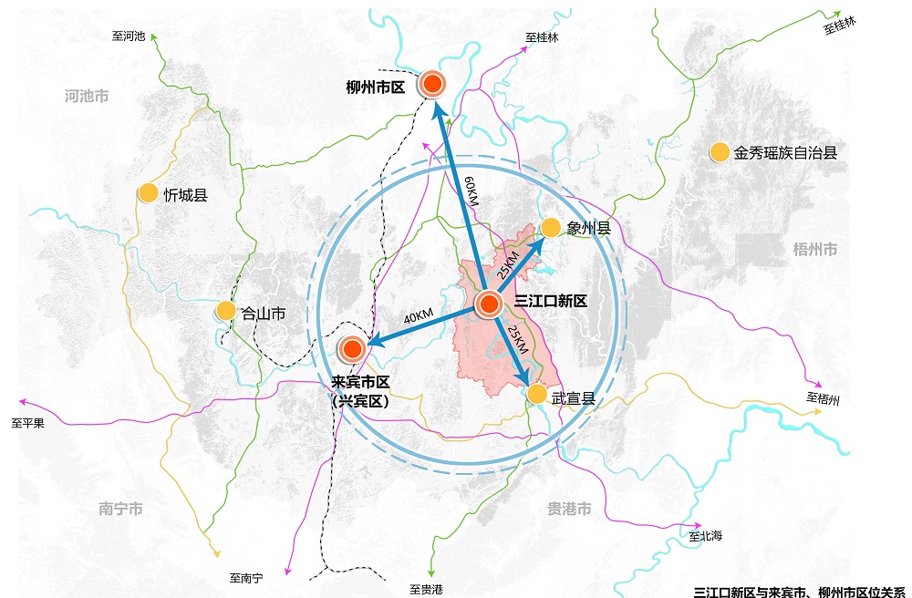 來賓市地處廣西中部地區(qū),緊鄰柳州、南寧兩大核心城市,北距柳州約65公里,西南距南寧約140公里,有“桂中腹地”之稱。三江口新區(qū)位于來賓市東部,是桂中“金三角”核心,也是“西江黃金水道重要節(jié)點”和“南柳經(jīng)濟(jì)走廊重要節(jié)點”,區(qū)位優(yōu)勢明顯。