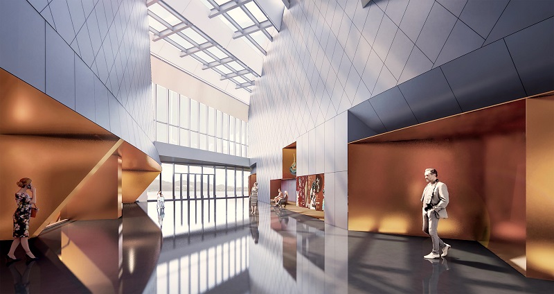 建筑方案以“海上帆、風中翼、云上錦”為總體設計理念,采用“一體兩翼”的規(guī)劃格局,力求以鮮明獨特的建筑形象,充分展現(xiàn)在建設自貿(mào)港這一新時代背景下海南地域文化的“展示與弘揚、傳播與交流、騰飛與發(fā)展”。整體建筑造型如海上揚帆的造型高低錯落呼應,建筑形體面向東側(cè)城市廣場開敞,又如張開的親和雙臂,將漫步人群攬入其中,把從西北西南街角引入的城市人群,會聚于建筑中心設有共享、咖啡、新聞發(fā)布等休閑互動區(qū)的“城市文化客廳”,并將建筑空間自然劃分為南北兩翼,即位于北側(cè)的瓊劇會館劇場與南側(cè)的非遺藝術博物館區(qū),宛如展翅欲飛的“風中雙翼”,迎海上來風。