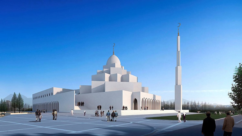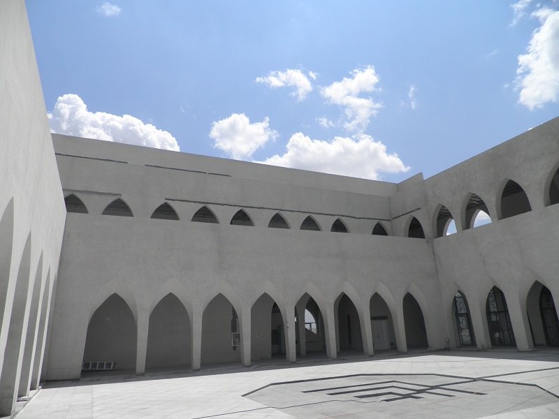 與禮拜殿相連的雙層環(huán)廊設(shè)計(jì),通過(guò)一系列的拱形門(mén)柱,將庭院緊密環(huán)抱。門(mén)柱的拱形在延續(xù)13-15世紀(jì)建筑風(fēng)格的基礎(chǔ)上,又加以了創(chuàng)新,門(mén)拱如扭曲的柳葉,形成自然曲面,朝向庭院。潔白的環(huán)廊與麻石地面,所構(gòu)成的機(jī)理對(duì)比,給人以莊嚴(yán)、樸實(shí)的印象。37m高的宣禮塔同樣采用運(yùn)用了同構(gòu)原理,將鋼結(jié)構(gòu)三棱柱體以幾何關(guān)系層層遞減,塔頂?shù)膶毱亢驮卵佬窝b飾物,與禮拜殿穹頂上的標(biāo)志遙相呼應(yīng),構(gòu)成伊斯蘭教"彎月涵星"象征。