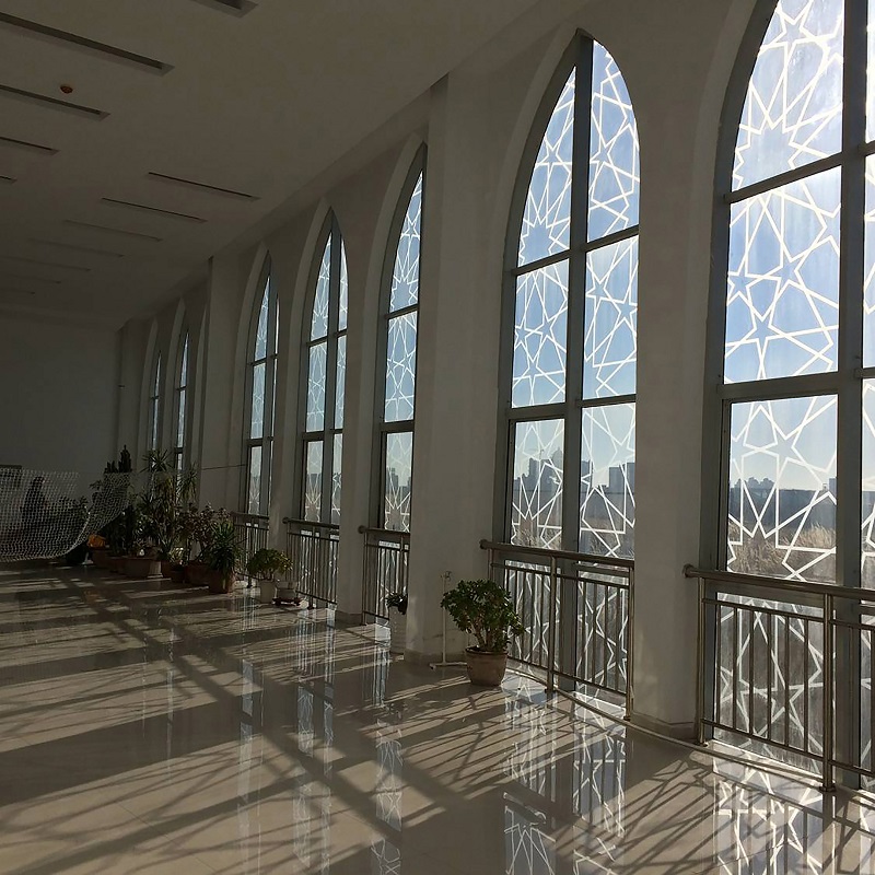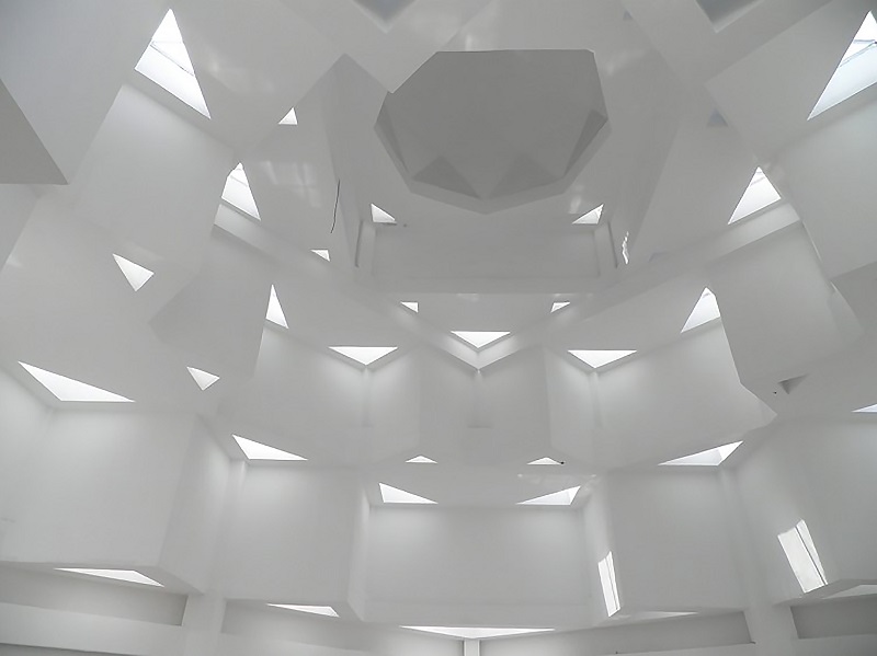 沿西北角三段式大臺(tái)階而上,可到達(dá)清真寺最重要部分的禮拜殿,也是建筑設(shè)計(jì)的“點(diǎn)睛”之筆:禮拜殿和穹頂?shù)脑O(shè)計(jì),運(yùn)用了同構(gòu)原理,將伊斯蘭紋樣進(jìn)行分解、變化后,生成新的幾何形體,每一層退臺(tái)與建筑形體旋轉(zhuǎn)相結(jié)合,產(chǎn)生更多、更豐富的三角形平面組合,利用這些組合,為禮拜殿上空設(shè)計(jì)了“逐層退臺(tái)”的三角形采光窗。給禮拜殿帶來(lái)了豐富的自然光源。同時(shí),一天內(nèi)的光束變化,也將人引向一個(gè)深邃的、神圣的、崇高的精神空間。
