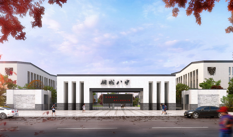 建筑理念——校園的歷史原型:“辟雍”體現(xiàn)了“天圓地方”的中國(guó)傳統(tǒng)宇宙觀。整個(gè)校園立面材質(zhì)以黑、白、灰為基調(diào),取徽派建筑之精華、融合現(xiàn)代建筑設(shè)計(jì)手法,脫離于傳統(tǒng),不失其韻味。中心造型力求現(xiàn)代、空靈、內(nèi)蘊(yùn),輪廓線平緩、舒展,塑造出桐城市第八中學(xué)的現(xiàn)代風(fēng)貌。布局上,中心雕塑作為整體校園的核心,圍繞中心雕塑設(shè)置行政綜合樓、高一、高二教學(xué)實(shí)驗(yàn)樓和高三教學(xué)樓。